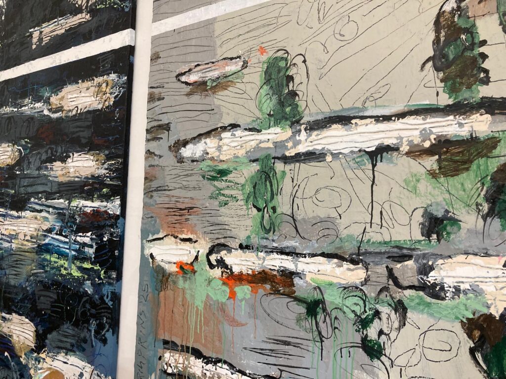 Het compositieschema dat ik al jaren hanteer bestaat uit horizontalen en verticalen. Daardoorheen dansen losse dots, losse kleurvlekken en grillige lijnen. juist het contrast met dat schema zorgt voor de levendigheid waar het mij om gaat.